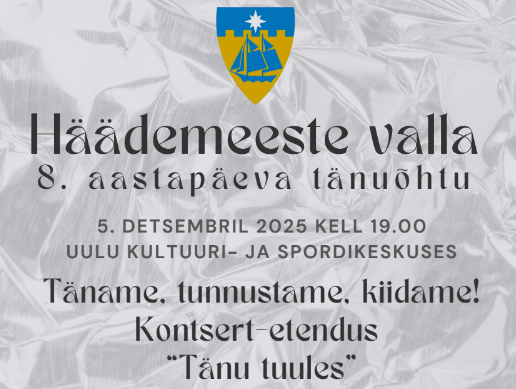 5. detsembril 2025 kell 19.00 Uulu Kultuuri- ja Spordikeskuses toimub Häädemeeste valla 8. aastapäeva tänuõhtu. Täname, tunnustame, kiidame ning kontsert-etendus "Tänu tuules". Tantsuks mängib...