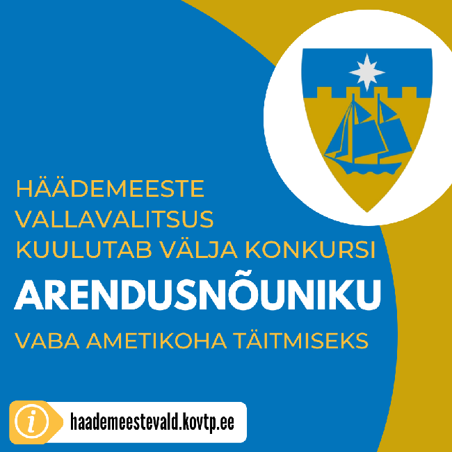 Kandideerimiseks esitada avaldus ja elulookirjeldus sh töö- või teenistuskäik (CV) hiljemalt 17. veebruariks 2025 aadressile haademeeste@haademeeste.ee märgusõnaga "arendusnõunik".