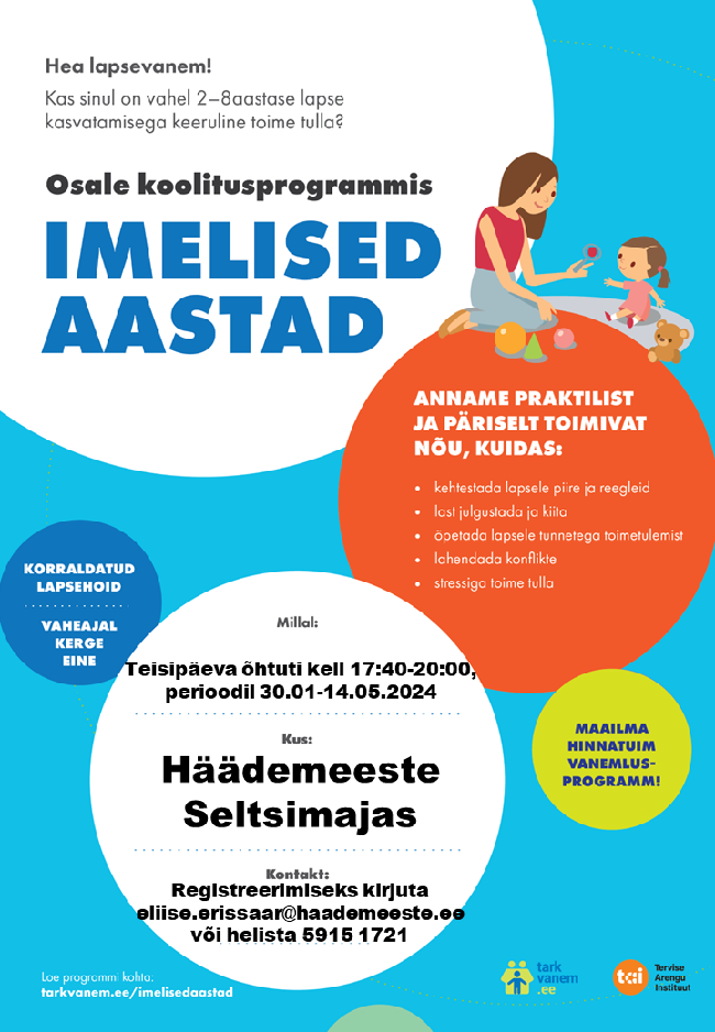 Hei 2-8aastaste laste vanemad! Ootame kõiki Häädemeeste valla lapsevanemaid, kelle lapsed on vanuses 2-8, osalema Häädemeeste Seltsimajas toimuvas vanemlusprogrammis "Imelised aastad".