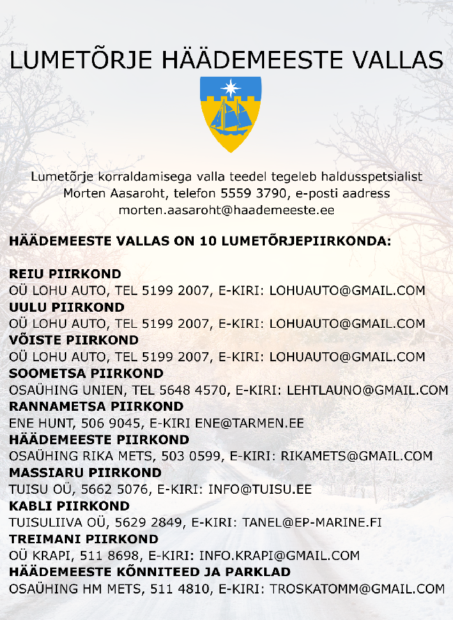 Valla kodulehelt on leitavad piirkondade kaardid koos vallale kuuluvate teedega, mida lumest puhastatakse. Kui kaardil märgitud teed pole lükatud, siis võta ühendust haldusspetsialistiga.